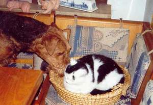 Als Gast benimmt sich Bijou der Katze gegenüber neugierig, aber respektvoll