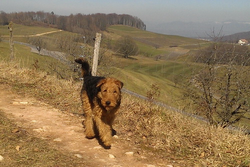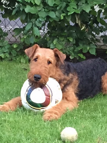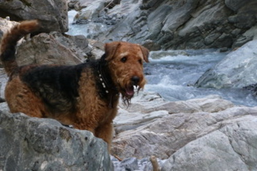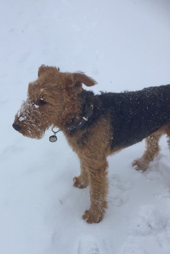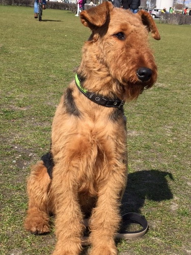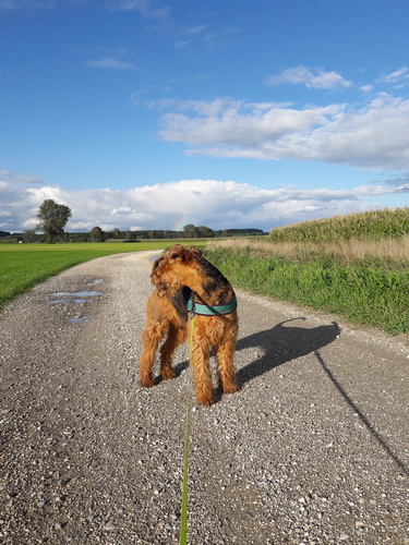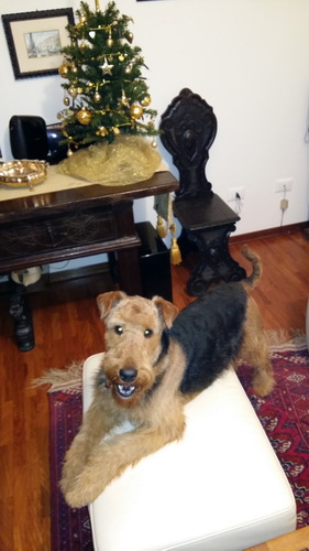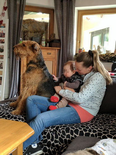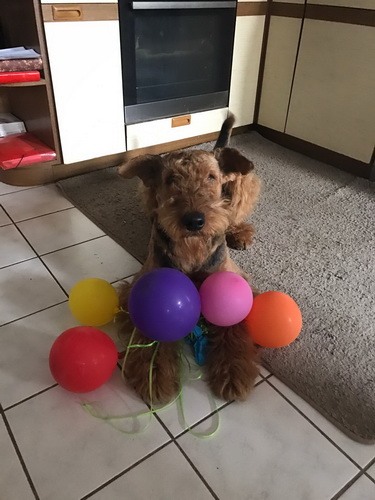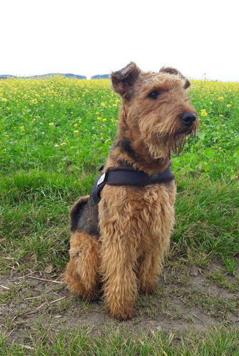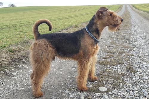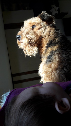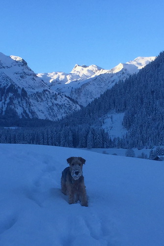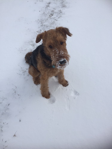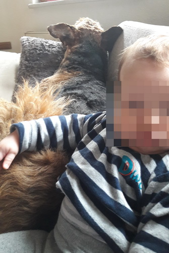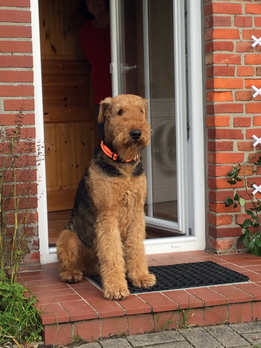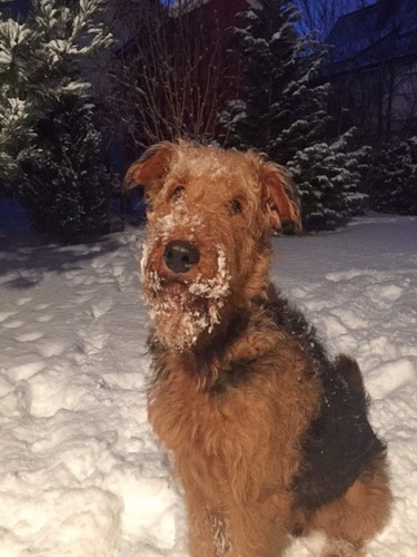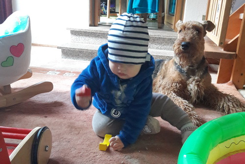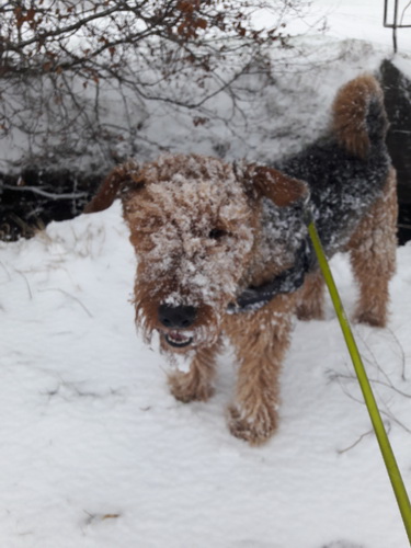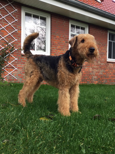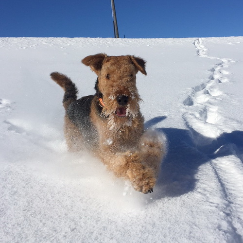 "... unser Brioso ist nun ein richtig erwachsener Hund, ein Schlitzohr und natürlich ein bißchen dickköpfig. Er ist wie jedes Jahr begeistert vom Schnee und meint, er müsse schneebahnen, indem er den Schnee frißt. Davon kann man ihn kaum abhalten, weil er das mit so einer Leidenschaft macht und er das anschließende Bauchweh in Kauf nimmt. Er ist überhaupt nicht empfindlich und kerngesund, wirklich richtig stabil. Seitdem er mit einem Kumpel mal abgehauen ist und lange Zeit verschwunden war, kann ich ihn nicht mehr ohne Leine laufen lassen, er büchst aus. Das muss wohl ein super Spaß für ihn sein. Beim letzten Versuch, ihn frei laufen zu lassen, im Herbst, fand er auf einer Wiese einen schwerverletzten Dachs. Er hat super reagiert, ging nicht an ihn ran, sondern bellte und zeigte uns, dass da Hilfe notwendig ist. Er lebte noch, war angefahren und von Mardern im hinteren Bereich ganz übel angefressen. Wir holten den Jäger und der bat mich mit Brioso weiter weg zu gehen, wenn er schießt und ihn danach aber wieder an das tote Tier zu holen, so dass er spürt, dass seine Aufgabe erledigt ist. War gut so für ihn und für uns. Wir haben ihn danach entwurmt und die notwendigen Impfungen hatte er ja sowieso. Das war wieder so ein ganz typisches Airedale Verhalten, klasse. Ansonsten haben wir viel Stress und spazieren und seine Bedürfnisse kommen etwas zu kurz. Meine Mutter ist letztes Jahr verstorben und wir müssen das Haus renovieren. So sind wir jede freie Minute auf der Baustelle. Und das macht er geduldig mit, ist im Staub und Dreck, akzeptiert alles, Hauptsache er darf dabei sein. Er sieht seine Aufgabe darin, die Handwerker zu begrüßen und zu kontrollieren, vor allem in den Pausen, bei der Brotzeit. Das ist dann der Höhepunkt des Tages, weil ab und zu etwas Leckeres für ihn herausspringt. Unsere älteste Tochter hat im April ein Baby bekommen. Wenn er die Kleine sieht, ist er so behutsam, nicht stürmisch vor Freude, sondern ganz ruhig und vorsichtig. Wir können ihn bedenkenlos mit ihr zusammen sein lassen, er versteht seine Aufgabe, dass er sie behüten muss, ausgezeichnet. Brioso ist ein gesunder, belastbarer Kerl, der uns in allen Lebenslagen geduldig und treu begleitet..."