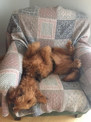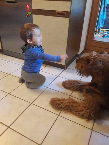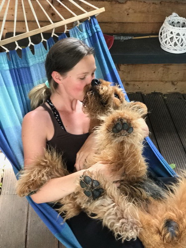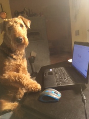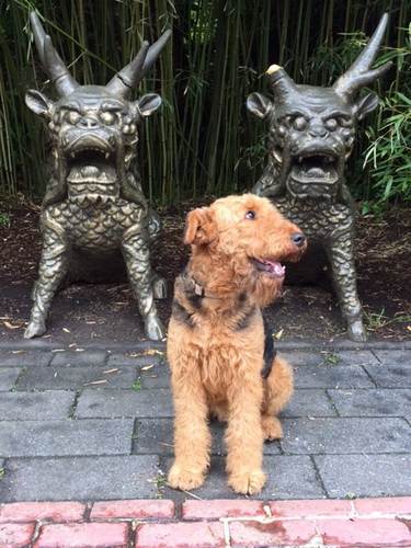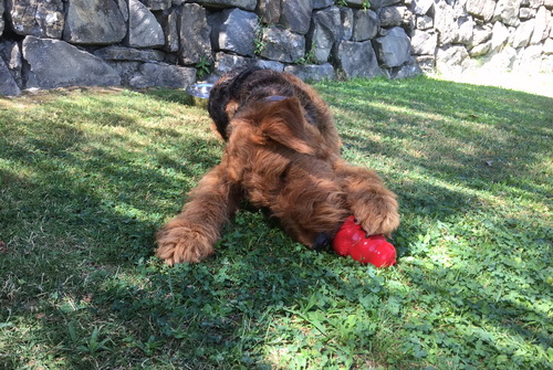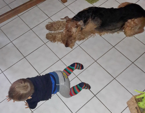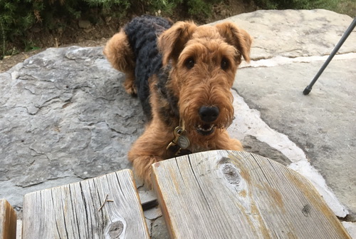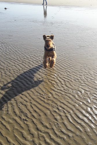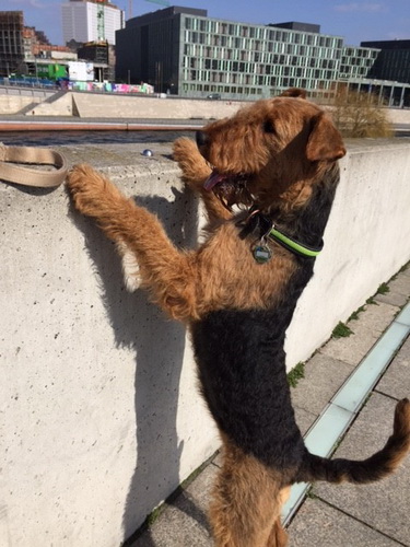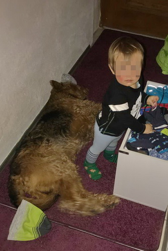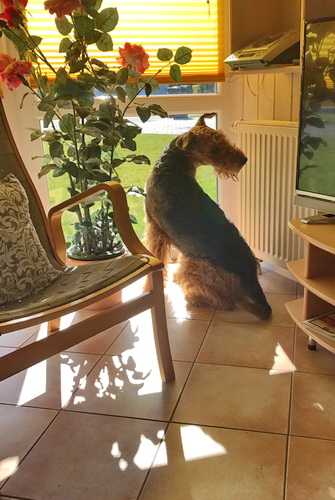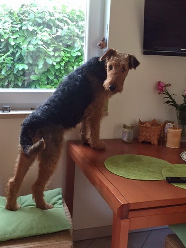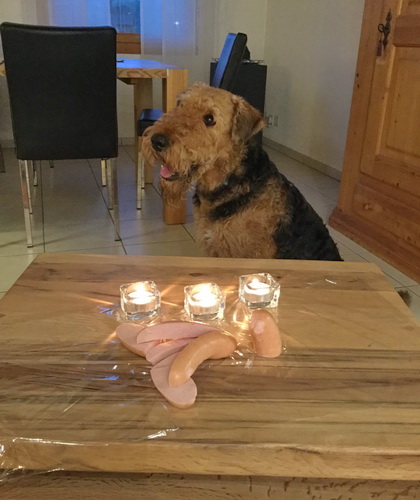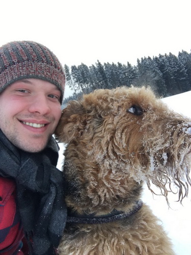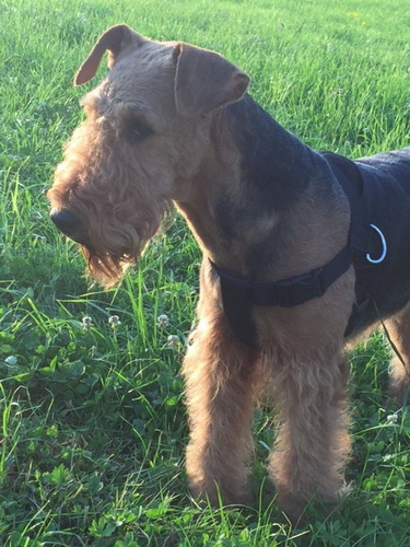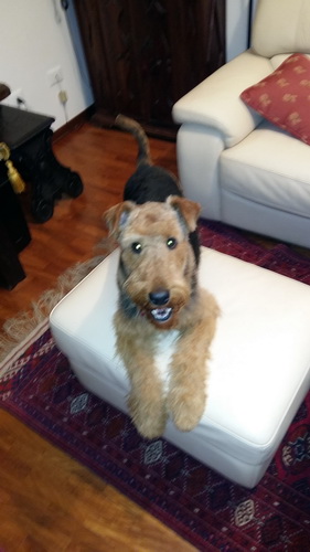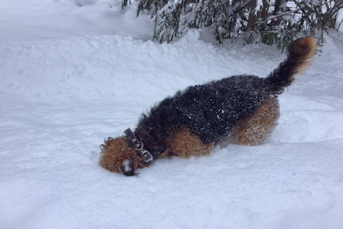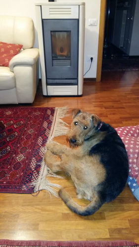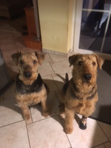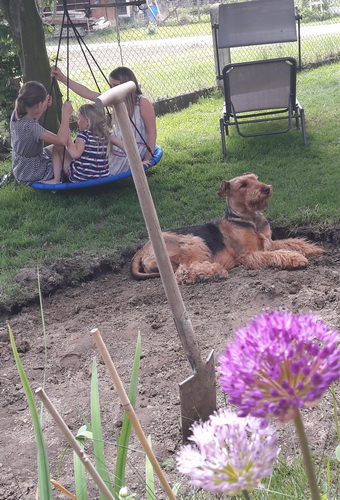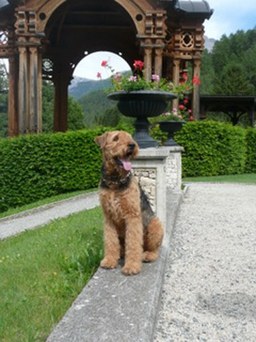 "... unser Brioso ist nun ein richtig erwachsener Hund, ein Schlitzohr und natürlich ein bißchen dickköpfig. Er ist wie jedes Jahr begeistert vom Schnee und meint, er müsse schneebahnen, indem er den Schnee frißt. Davon kann man ihn kaum abhalten, weil er das mit so einer Leidenschaft macht und er das anschließende Bauchweh in Kauf nimmt. Er ist überhaupt nicht empfindlich und kerngesund, wirklich richtig stabil. Seitdem er mit einem Kumpel mal abgehauen ist und lange Zeit verschwunden war, kann ich ihn nicht mehr ohne Leine laufen lassen, er büchst aus. Das muss wohl ein super Spaß für ihn sein. Beim letzten Versuch, ihn frei laufen zu lassen, im Herbst, fand er auf einer Wiese einen schwerverletzten Dachs. Er hat super reagiert, ging nicht an ihn ran, sondern bellte und zeigte uns, dass da Hilfe notwendig ist. Er lebte noch, war angefahren und von Mardern im hinteren Bereich ganz übel angefressen. Wir holten den Jäger und der bat mich mit Brioso weiter weg zu gehen, wenn er schießt und ihn danach aber wieder an das tote Tier zu holen, so dass er spürt, dass seine Aufgabe erledigt ist. War gut so für ihn und für uns. Wir haben ihn danach entwurmt und die notwendigen Impfungen hatte er ja sowieso. Das war wieder so ein ganz typisches Airedale Verhalten, klasse. Ansonsten haben wir viel Stress und spazieren und seine Bedürfnisse kommen etwas zu kurz. Meine Mutter ist letztes Jahr verstorben und wir müssen das Haus renovieren. So sind wir jede freie Minute auf der Baustelle. Und das macht er geduldig mit, ist im Staub und Dreck, akzeptiert alles, Hauptsache er darf dabei sein. Er sieht seine Aufgabe darin, die Handwerker zu begrüßen und zu kontrollieren, vor allem in den Pausen, bei der Brotzeit. Das ist dann der Höhepunkt des Tages, weil ab und zu etwas Leckeres für ihn herausspringt. Unsere älteste Tochter hat im April ein Baby bekommen. Wenn er die Kleine sieht, ist er so behutsam, nicht stürmisch vor Freude, sondern ganz ruhig und vorsichtig. Wir können ihn bedenkenlos mit ihr zusammen sein lassen, er versteht seine Aufgabe, dass er sie behüten muss, ausgezeichnet. Brioso ist ein gesunder, belastbarer Kerl, der uns in allen Lebenslagen geduldig und treu begleitet..."