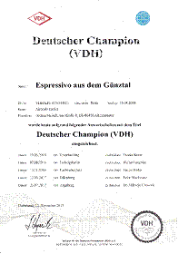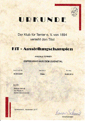 Conans Urkunden über seine Titel "KfT-Ausstellungschampion" und Deutscher Champion VDH sind eingetroffen.