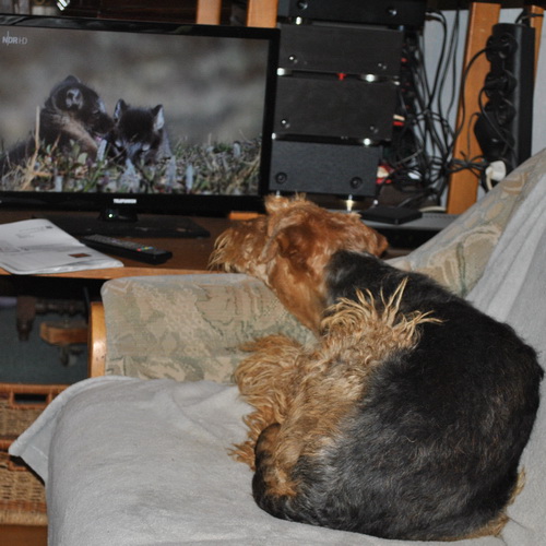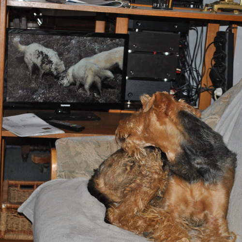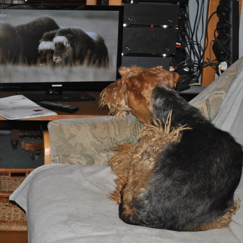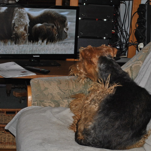Rakli interessiert sich selten für Nachrichten, aber für Polarwölfe, Polarfüchse und Moschusochsen schon - aber Hunde können ja angeblich nichts im Fernseher erkennen ...