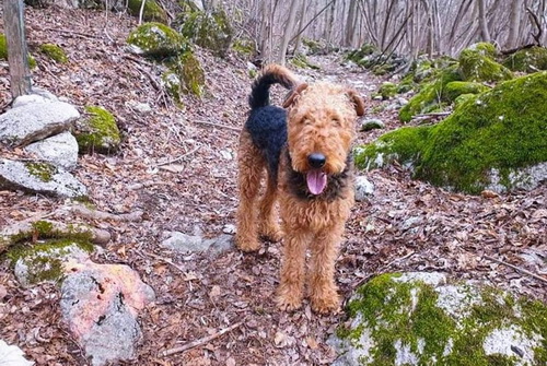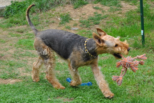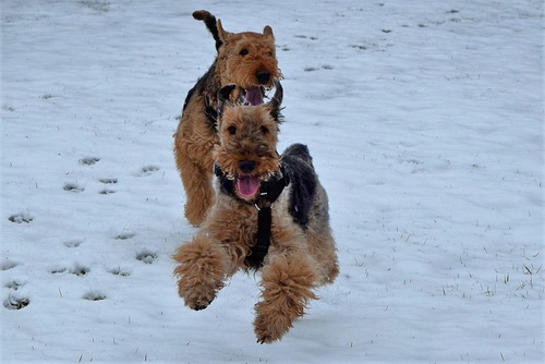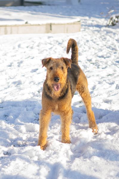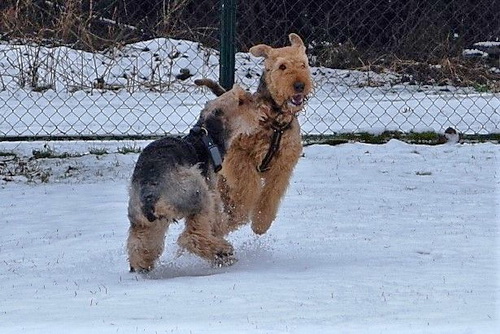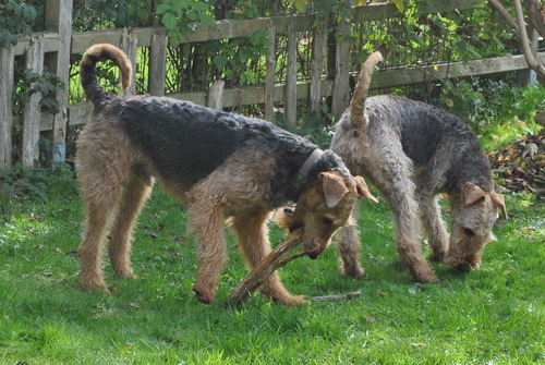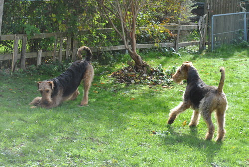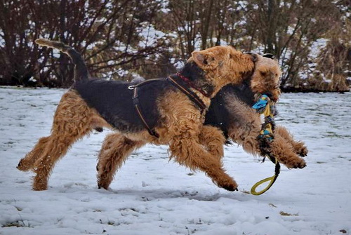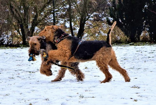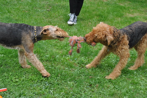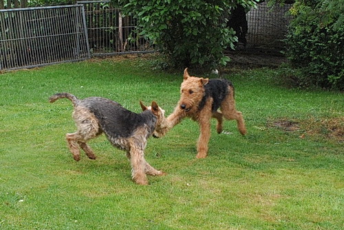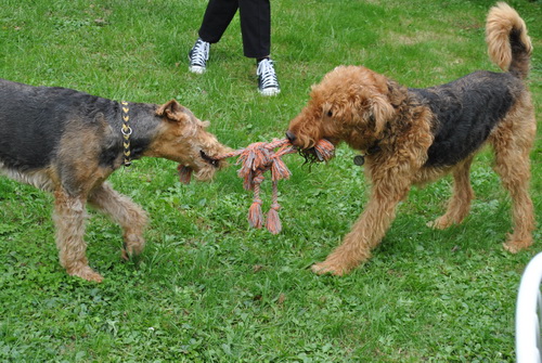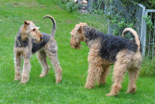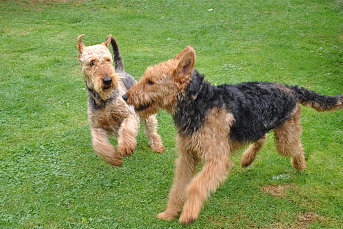 ein junger Hund. Cisco und Santos (Airedale-Rüde, 3 Jahre) verstehen