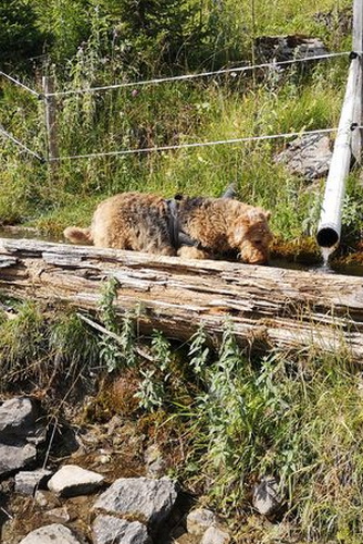 "Die Bilder zeigen einen von Idas Lieblingsplätzen in diesem herrlichen Bergsommer in den Alpen. Kaltes Wasser, aber nur bis zum Bauch, entspricht genau ihrer Vorliebe für eine Erfrischung auf unseren Wanderungen. Wir erholen uns bestens und sind alle wohlauf."