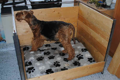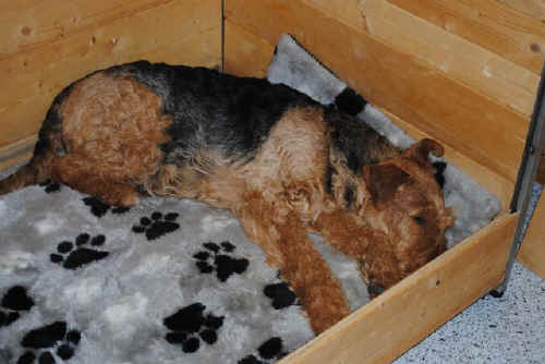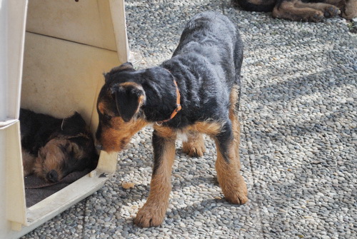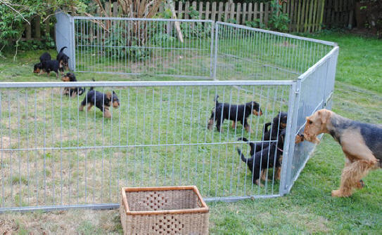 Der erste Umzug ist abgeschlossen: Callas C's sind jetzt im Welpenzimmer mit Draußenwelt, Dannys Welpen sind im Welpenzimmer. Der Garten ist derzeit zu heiß und zu sehr in der prallen Sonne für die Kleinen.