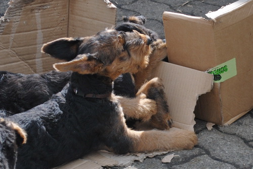 Dannys Welpen sind nun auch im Welpenzimmer mit Draußenwelt. Die Zusammenführung der Kleinen verlief ohne Probleme.