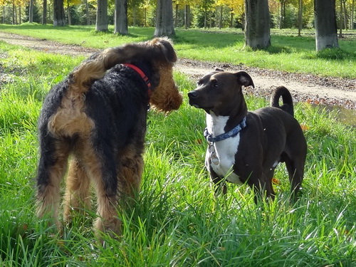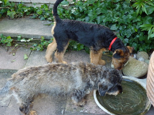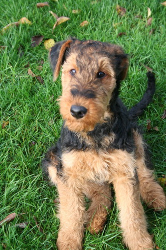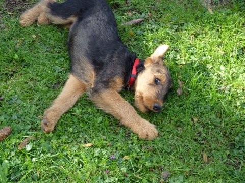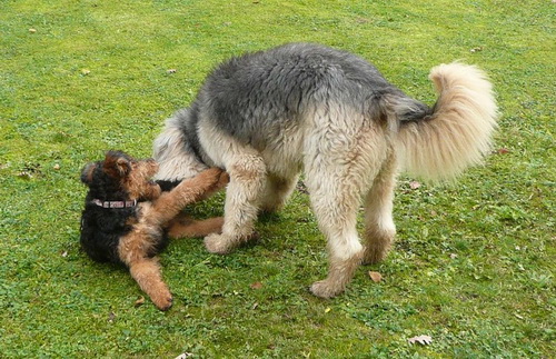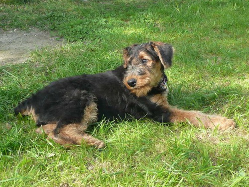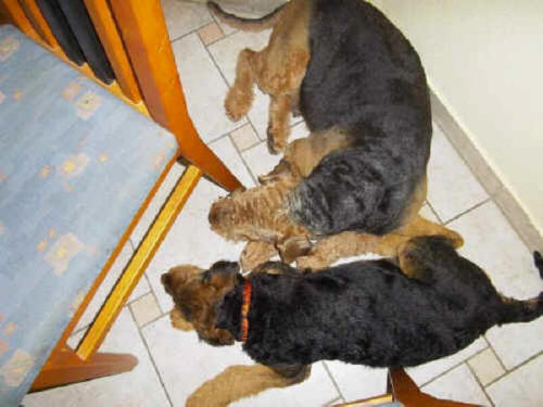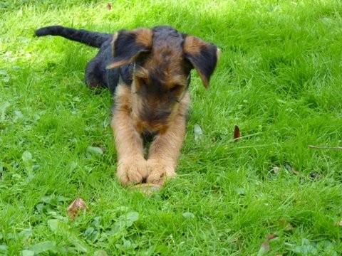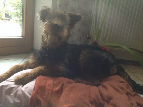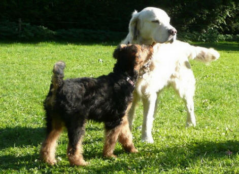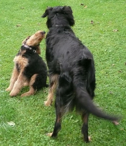 Daisy hat wieder selber geschrieben: "Hallo Ich melde mich nun auch mal wieder nachdem ich jetzt schon zum 2. und auch schon das dritte Mal bei der Hundeschule war. Es war wie immer sehr aufregend für mich, da immer etwas zum Spielen und Lernen dabei ist. Die haben da einen so komischen Tunnel gehabt, der war ziemlich lang, meine anderen Hundefreunde hatten da ziemlich Angst, aber ich als Airedale doch nicht! Ich sauste durch den Tunnel hindurch und auf der anderen Seite wieder heraus und dann über die Wackelbrücke rüber und weiter über den Hindernisparcours, es war richtig toll. Natürlich ist das Spielen am schönsten mit den anderen Kollegen. Die 2 Irischen Wolfshunde waren auch wieder da. Diesmal haben meine Zweibeiner ihren Fotoapparat dabeigehabt und haben auch ein paar Fotos gemacht. Ich fühle mich hier pudelwohl, mit den Nachbarn flirte ich auch jeden Tag, die sind voll nett, wenn ich draußen bin im Garten und kommen gleich an den Gartenzaun. Ich bin jetzt schon um einiges gewachsen und voll der Liebling von allen, auch wenn ich wieder mal meine 5 Minuten habe und das ganze Haus und den Garten als Rennbahn benutze, da gehen alle ganz schnell weg. So das war's für heute bis zum nächsten Mal Deine Daisy"