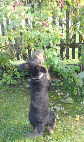 Abisha "geht es sehr gut. Sie ist eine ganz "Süße". Fängt jetzt schon das Tau und einen Netzball aus der Luft. Dafür hänge ich mit dem normalen Hundetraining etwas - doch sie ist noch zu verspielt. Selbst beim Fressen ist die Fliege an der Wand wichtiger als das Fressen. Überhaupt ist sie eine kleine genäschige Genießerin. Sie unterbricht ihre Mahlzeit, möchte kurz raus, obwohl sie gerade draußen war, um dann vergnügt wieder zum Napf zu springen. Für Hüttenkäse tut sie Alles, ach ja - und Hagebutten - immer noch!"