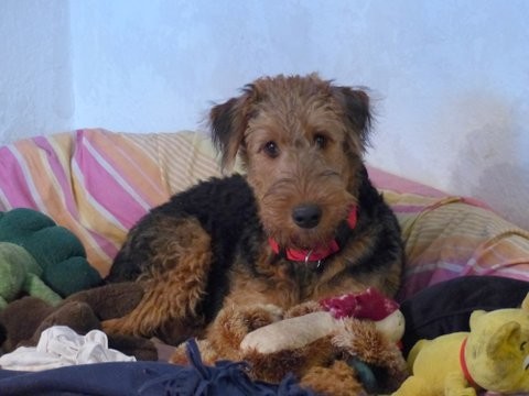 Abisha fährt mittlerweile s ehr gern Auto, sie geht problemlos mit in die Stadt, lernt gern und schnell - aber sie macht auch allen Airedale-Blödsinn!