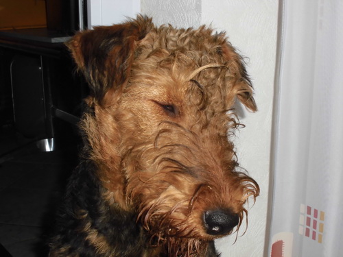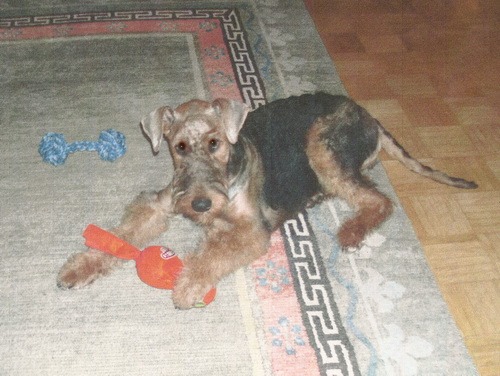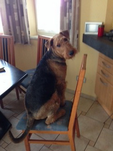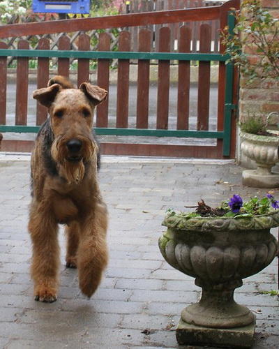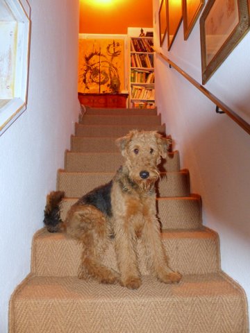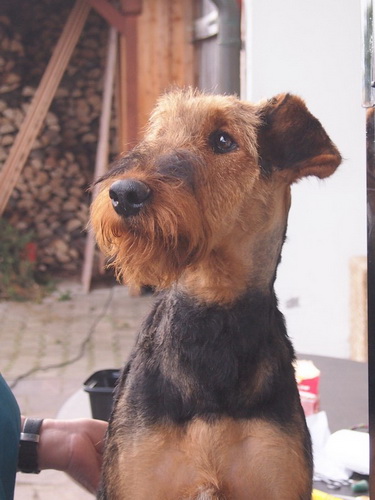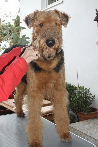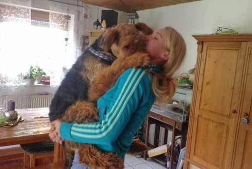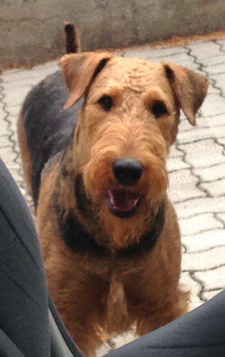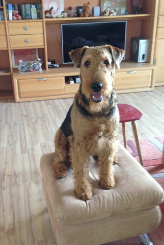 Joschi "...Uns dreien geht es gut. Joschi entwickelt sich zu einem "braven" Hund. Er wird seinem Airedale-Charakter sehr gerecht, indem er manchmal überlegt, soll ich jetzt wirklich zum Frauchen kommen? Auch trägt er immer unbändige Freude in sich, wenn jemand zurückkommt, sei er auch nur 5 Minuten von ihm weggewesen ..."