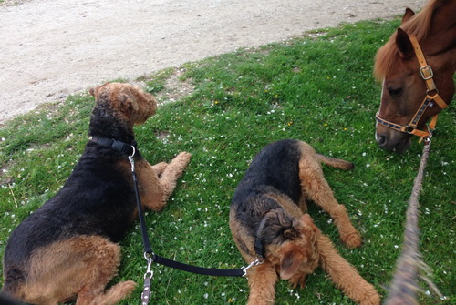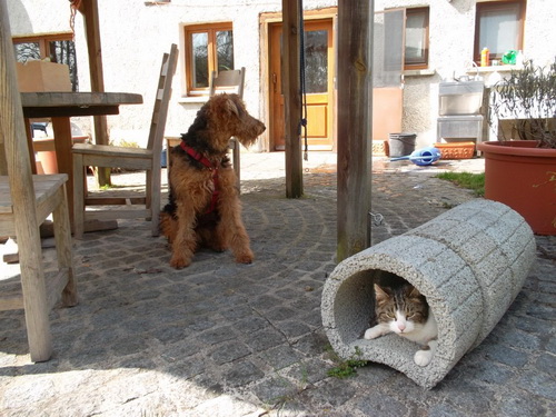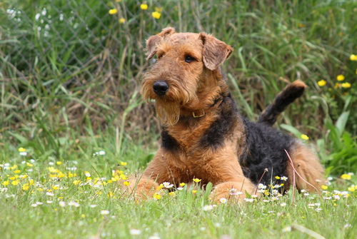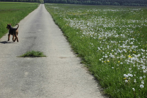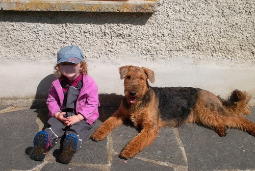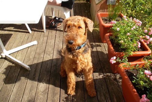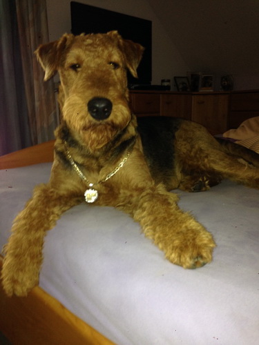 "Hallo, ich, Daisy aus dem Illertal, melde mich mal wieder, damit ihr mich nicht vergesst. Ich habe euch ein paar Fotos von meinem Ausflug mitgebracht. Mir geht es hervorragend und nachdem meine Ohren angeklebt waren, sehe ich jetzt wie ein Airedale Terrier aus und nicht mehr wie ein Flugzeug. Treppensteigen mag ich immer noch nicht, da rutsche ich immer aus. Auf der anderen Seite: warum soll ich eigentlich die Treppen hochgehen, wenn mich meine Dosenöffner doch so schön die Treppen hochtragen. Zur Zeit habe ich ein Kampfgewicht von 20,5 kg und bin 53 cm gross (Schulterhöhe); von den 20,5 kg ist jedes Pfund auf Blödsinn eingestellt, den ich anstelle, sagt mein Herrchen, dabei mache ich doch gar nichts. Sehe ich vielleicht so aus????Als ob ich was anstellen könnte????"