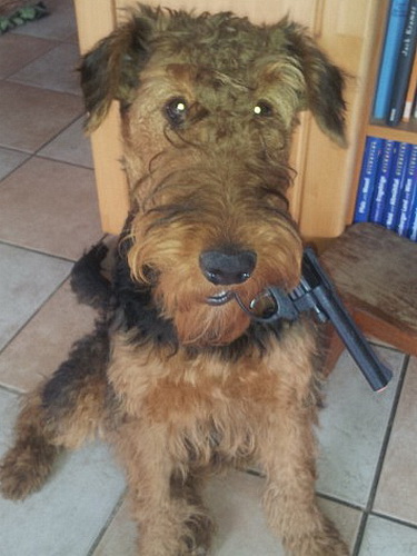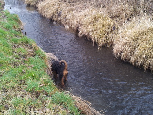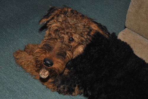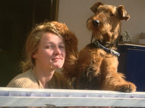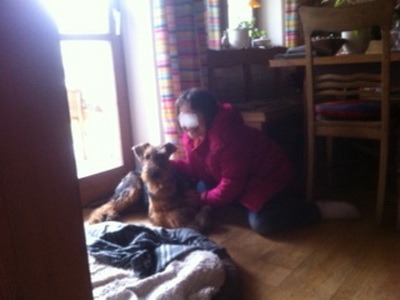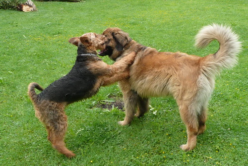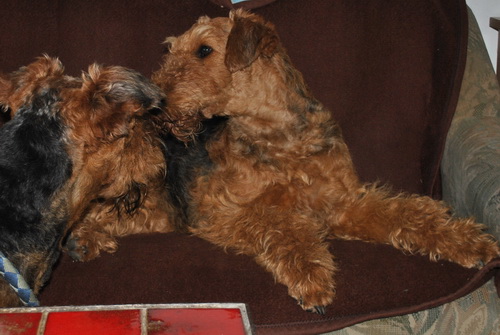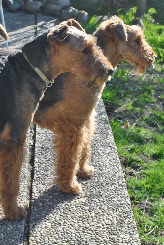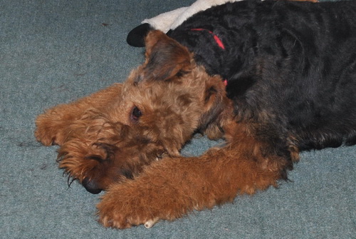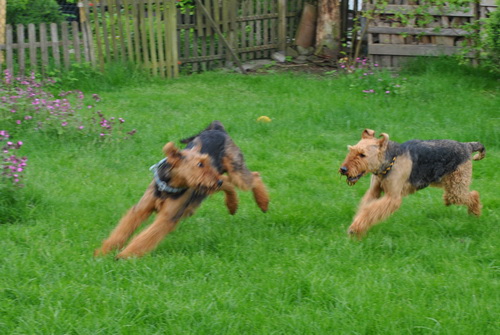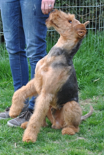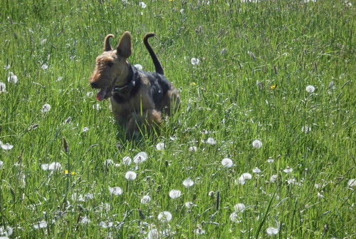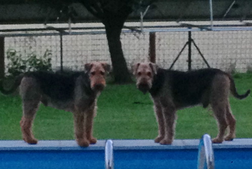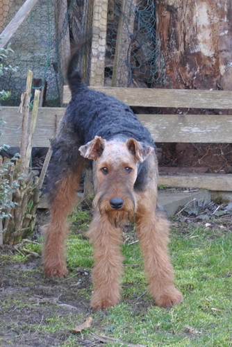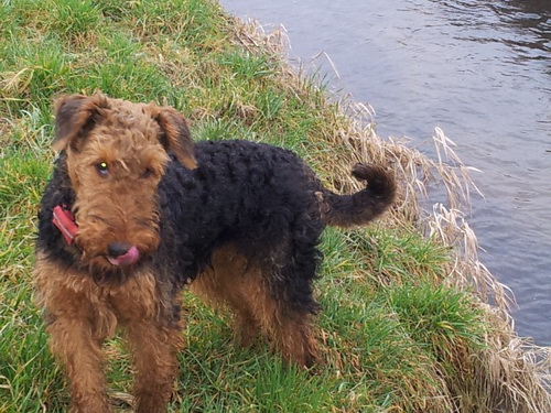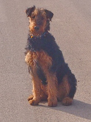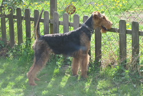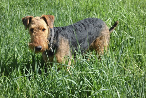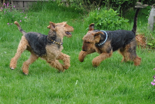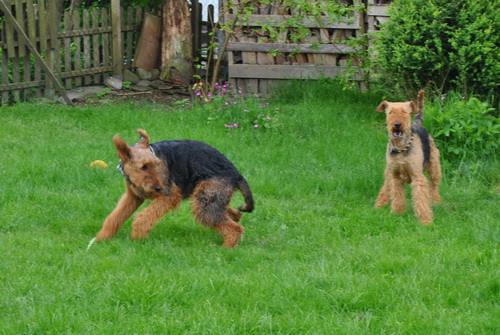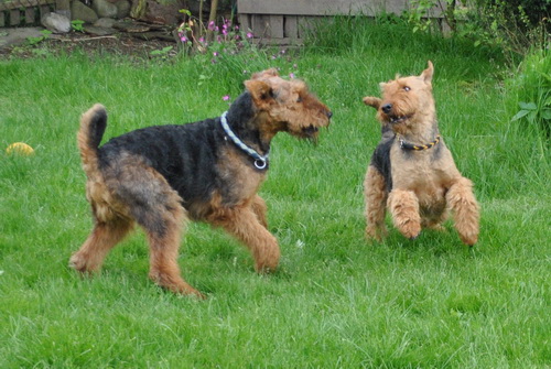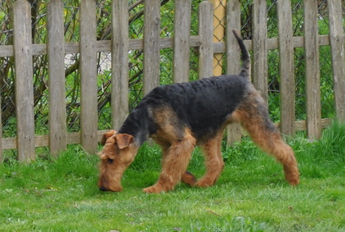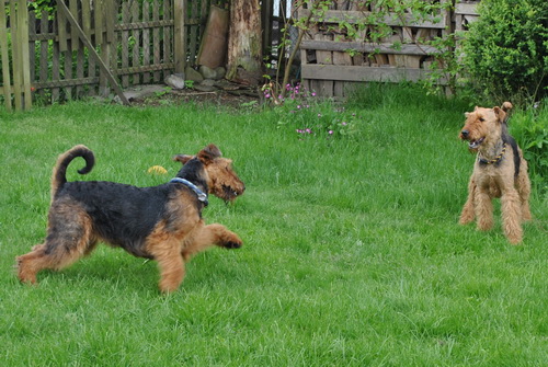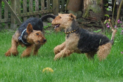 Amy Amys Herrchen berichtet, daß sie den Vergleich mit den früheren Airedales der Familie nicht zu scheuen braucht. Es gehe ihr gut, jetzt könne sie auch schon Treppensteigen, und sie wickelt alle um die Pfote. Ihr bester Freund ist ein Australian Shepherd in der Nachbarschaft, mit dem sie sogar im Wald frei laufen darf ...