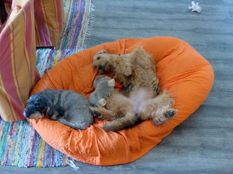 In der Hundeschule zeigt er sich brav und macht auch Fortschritte. (ich musste gerade eine Tipppause einlegen, da Cisco gerade mit einer Socke von mir gekommen ist und sich nach kurzem Streicheln nun hinter mir auf den Boden gelegt hat und mich beobachtet. Dies ist allerdings nichts ungewöhnliches, denn er (und auch Roy) kommen häufig "nach mir sehen" wenn ich im ersten Stock arbeite oder lerne). Dinge wie Ablegen oder Absitzen und an der Stelle warten stellen keine Probleme dar. Einzigst war vor kurzen die Hundepubertät etwas spürbar, da es doch sehr interessant war, dass es da überall nach Hundemädchen riecht und ich doch tatsächlich wollte, dass er mir die Aufmerksamkeit schenkt. Den anderen Hunden, denen wir dort begegnen, egal ob Welpe, Junghund oder erwachsener Hund, egal ob Rüde, Hündin, kastriert oder nicht, begegnet er sehr freundlich. Er ist weder aggressiv noch ängstlich anderen Hunden gegenüber und lässt sich auch von einem kurzen Anknurren weder provozieren noch verschrecken. Das einzigste ist - typisch Airedale - die königliche, etwas herablassende Positionierung und Haltung, um sich zu präsentieren. Stimme hat er mittlerweile eine sehr laute und mächtige. Nachts (wenn ich später nach Hause komme) hört es sich doch schon nach einem sehr guten Wachhund an, wenn er in der Dunkelheit hinter der Eingangstüre meine Ankunft meldet. Weiters hat er mittlerweile "gelernt", dass man Bescheid gibt, wenn eine Katze im eigenen Revier gesichtet wird, er lässt sich aber mit einem Wort oder Pfiff sofort wieder beruhigen oder zu sich rufen. Eine lustige Entdeckung haben wir im Bezug auf Cisco´s Stimme und deren Einsatz auch noch gemacht. Da Roy ja nur mehr begrenzt hört, "leiht" Cisco ihm seine Ohren. Denn Cisco reagiert auf Hundegebell in der Nachbarschaft oder beunruhigende Geräusche und "meldet" diese per Bellen Roy, da sie dieser eben nicht selbst wahrnehmen kann. Das Verhältnis der beiden Rüden ist einfach traumhaft. Wir selbst sind immer wieder beeindruckt wie viel Kontakt, Nähe und Zuneigung zwischen den beiden herrscht. Es gibt weder Futterstreitigkeiten - beide können miteinander einen Löffel ablecken ohne Probleme - noch sonst irgendwelche Streitigkeiten. Er respektiert Roy größtenteils und lässt diesen nach einem kurzen Knurren sofort in Ruhe, wobei dieses Knurren noch nie böse war. Beide toben sehr viel miteinander, wobei Cisco dabei teilweise seine Kraft etwas unterschätzt und Roy etwas damit nervt, aber auch in einer solchen Situation ist noch nie eine verärgerte Geste von einem der beiden gekommen, weder von Roy bei einer Zurechtweisung, noch von Cisco als Reaktion darauf. Beide schlafen auch immer wieder nahe nebeneinander und auch kuscheln steht bei den beiden auf der Tagesordnung.