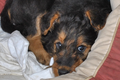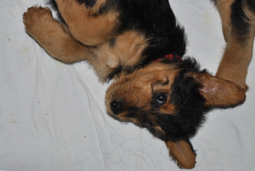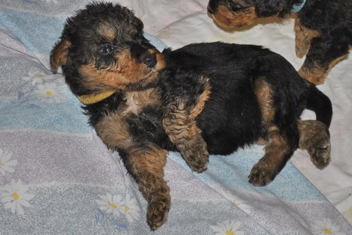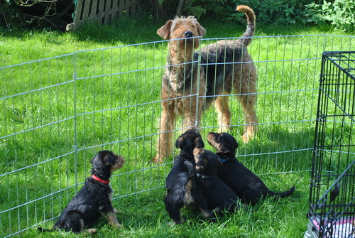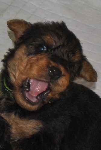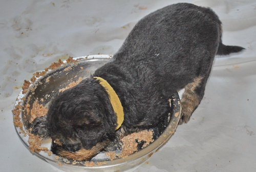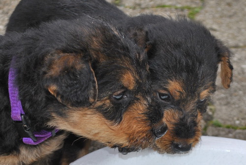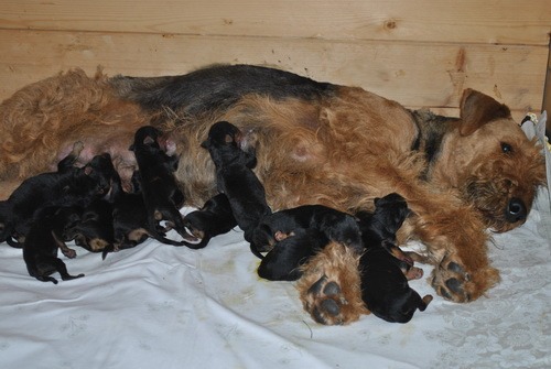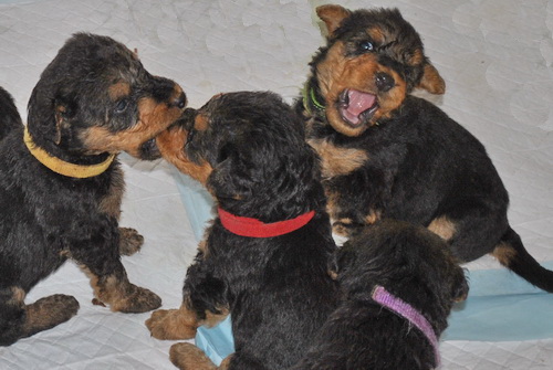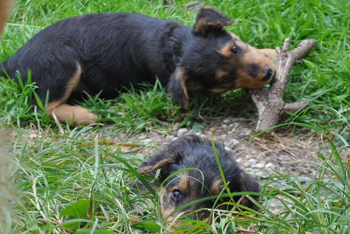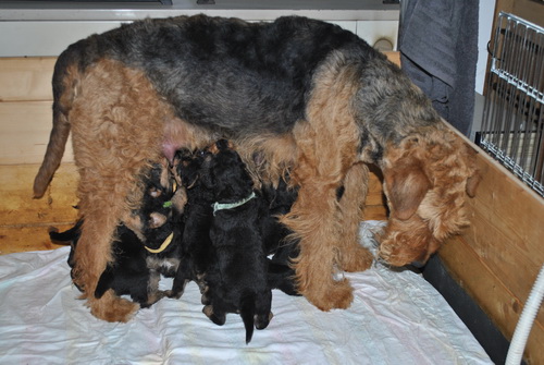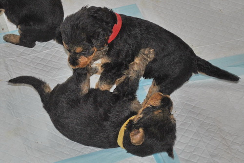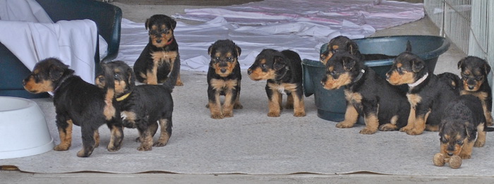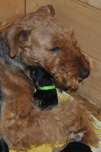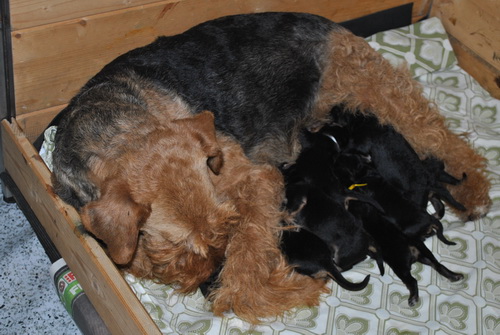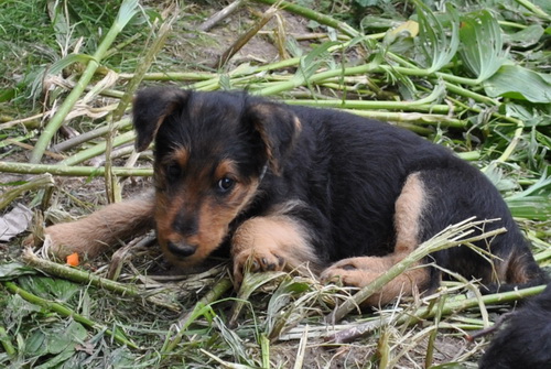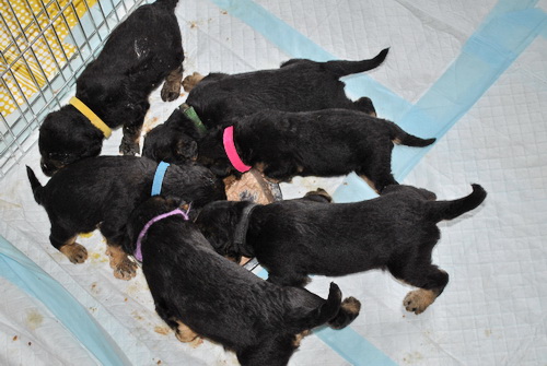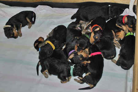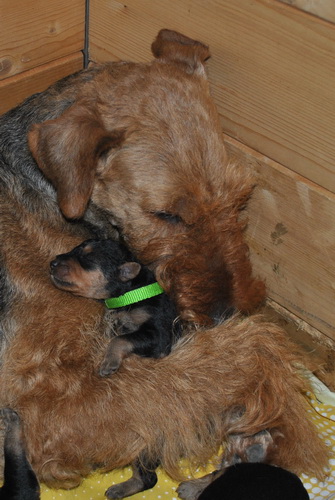Danny und den Kleinen geht es gut. Die Welpchen haben ihr Gewicht seit ihrer Geburt mehr als verdoppelt. Sie träumen zum Teil recht lebhaft - von was träumen Welpen, die Welt noch nie gesehen oder gehört haben??? Ein Welpe kann heulen wie ein ganz kleiner Wolf, und einer versucht sich im Bellen - ansonsten klingen sie wie kleine Krokodile.
