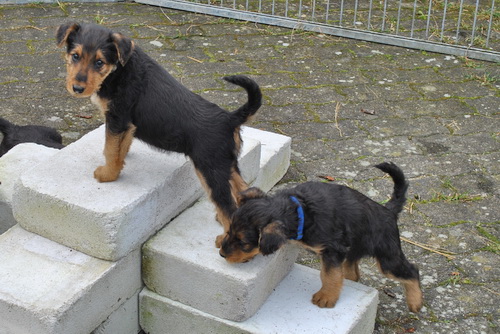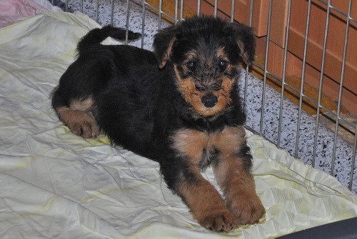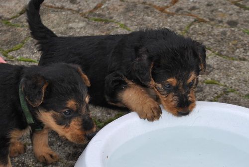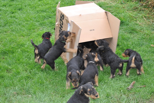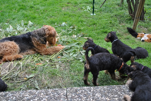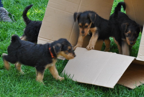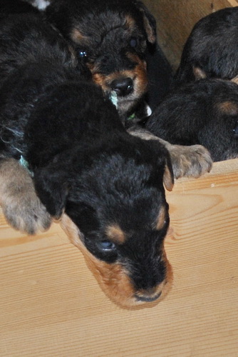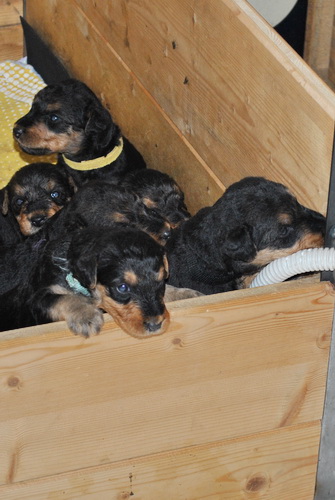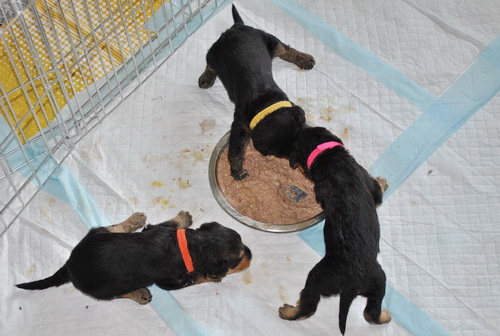 Die Kleinen fressen nun Brei zusätzlich zur Muttermilch und seit heute verlassen sie die Wurfkiste - sie haben deutlich gezeigt, daß sie raus wollen: