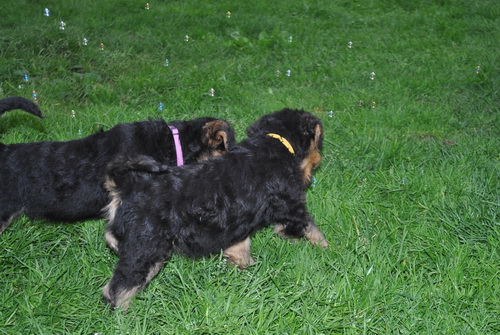 Heute war der Rest von uns auch beim Tierarzt, das war schon aufregend und ermüdend genug - aber nein, danach war dann auch Badetag für uns alle - angeblich duften wir nun sehr gut. Nach ausgiebigem Schlaf gab es dann zum Schluß noch Hundeseifenblasen.