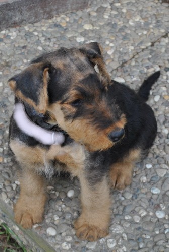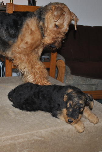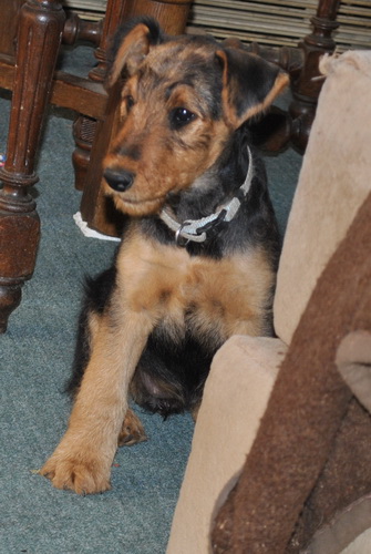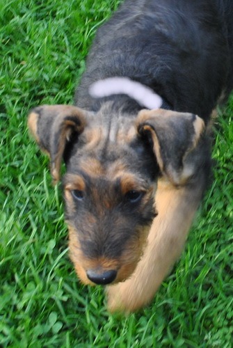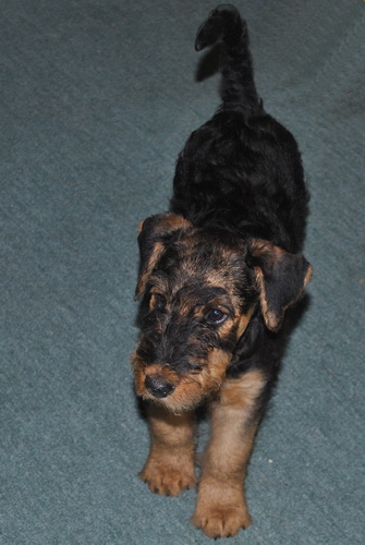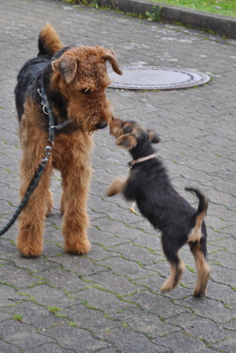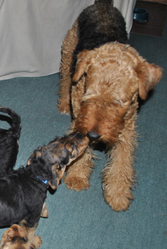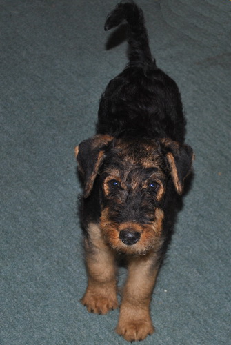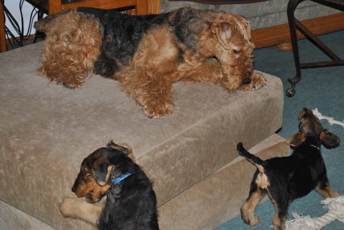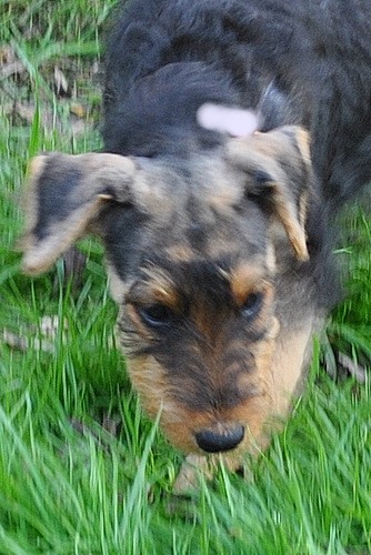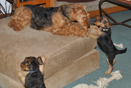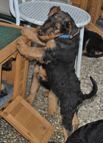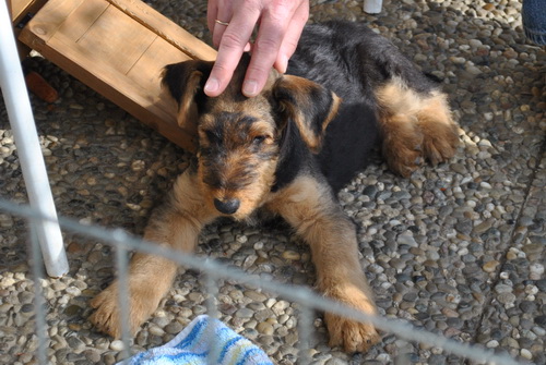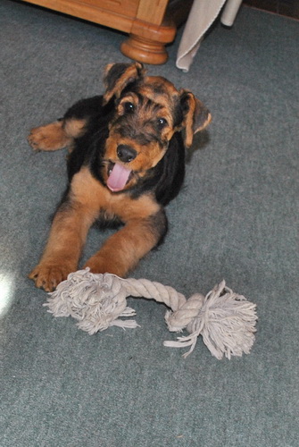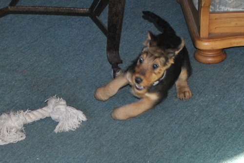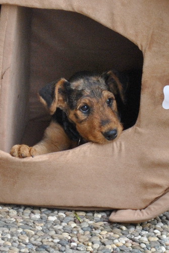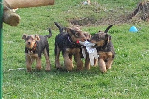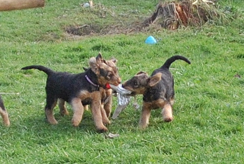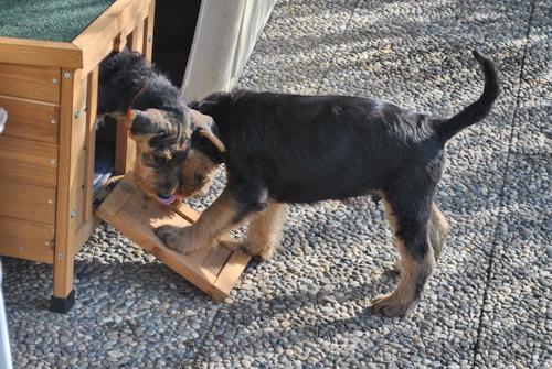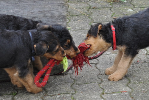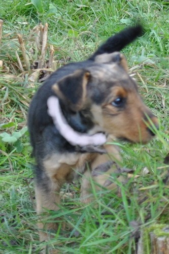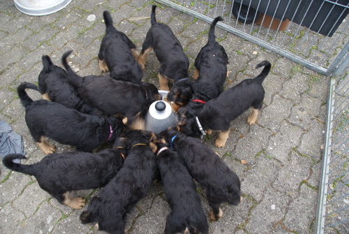 Da "Garten" wegen Nässe ausfiel, haben wir uns andere Betätigungen gesucht. Wir haben den Tag damit begonnen, daß wir selbständig aus dem Welpenzimmer ausgebrochen sind und uns mal ein bißchen im Haus umgesehen haben. Wir haben Besucher empfangen und uns von unsern besten Seiten gezeigt. Und es war Apfeltag! Wir haben Calla so bestürmt, daß sie das Welpengehege lieber wieder verlassen hat. Abends haben wir dann noch wilde Jagd gemacht.