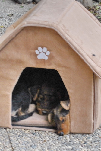 Heute wurde ausgiebig mit uns geschmust - war das schön! Es waren viele Menschen da. Außerdem sind wir unter die Hausbesitzer gegangen; es gab ein vielseitig verwendbares Hundehaus ...