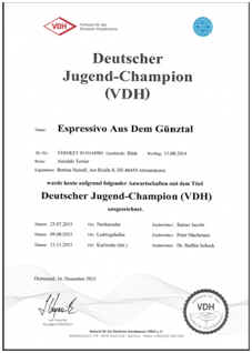 Conan hat auf der Internationalen Ausstellung in Karlsruhe wieder die Bewertung "vorzüglich 1" erhalten und die Titelanwartschaften in der Jugendklasse bekommen - damit erfüllt er nun die Bedingungen für die Verleihung des Titels VDH-Jugendchampion!