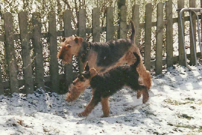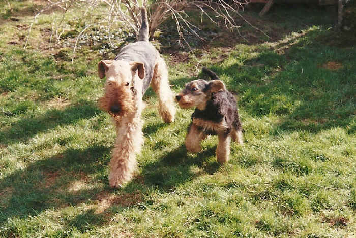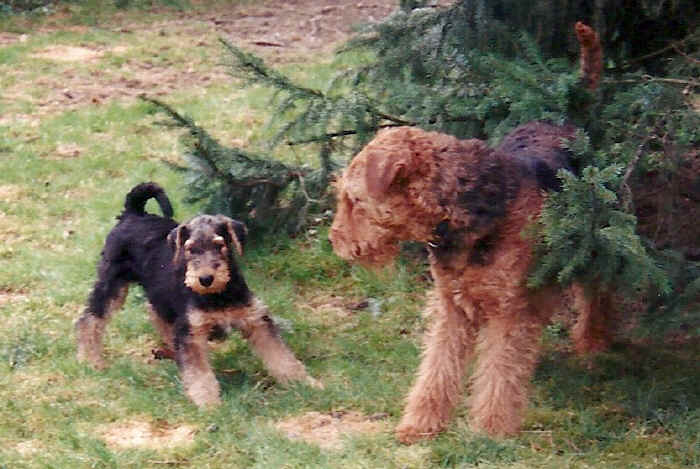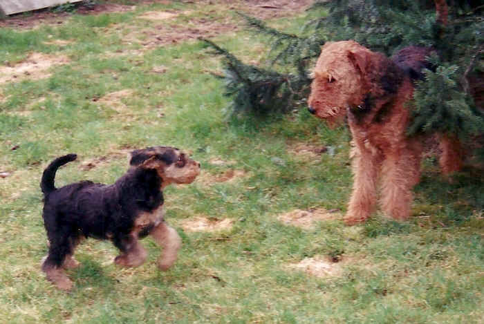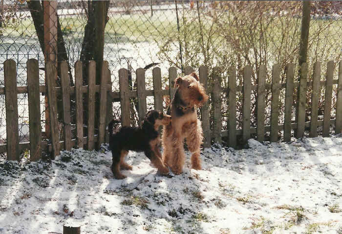 Brief an Luxis künftige Besitzer: Luxi hat sich in den letzten Tagen zu einem ordentlichen Esser entwickelt. Er hat gewisse Vorlieben, aber er nimmt mittlerweile auch eifrig Hundenahrung zu sich. Bei Nachbars hat er Gemüse und Obst kennen und schätzen gelernt und hier frißt er morgens und abends Dosenfutter und auch –man höre und staune! – knack für knack Puppy-Trockenfutter. Zum Dessert nimmt er noch ein Häppchen Katzenfutter, und Leckerlis zwischendurch weiß er sehr zu schätzen. Daß er als Aufforderung an das Service-Personal die Katzenschüssel durch die Gegend trägt, nun ja, das kennt man und findet es süß. Aber er scheint Ameisen, Lastenkräne und Cargolifter in seinen Vorfahren zu haben – er trägt auch die Futterschüsseln der Großen, Stiefel und Brennholz von 50 cm Länge herum. Im übrigen hat er keine Probleme mehr, auf dem Couchtisch nach menschlichem Getränk zu sehen und ein Schlückchen zu nehmen. Als überzeugter Anhänger zusätzlicher vegetarischer Frischkost nimmt er hier ein Häppchen leckeres Rosenholz, dort ein Frühlingsblütchen und dann 2-3 Gräslein. Bei Nachbars hat er gelernt, treppauf zu laufen – abwärts kann er noch nicht – sein Gesicht dabei solltet ihr sehen!